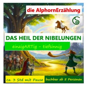 Die AlphornErzählung "Das Heil der Nibelungen" unter der WeltEsche ist inspiriert vom "Ring des Nibelungen" dem Opernwerk von Richard Wagner. Diese einzigARTige - tiefsinnige Geschichte steht stellvertretend für eine Idee die Welt in Heilung zu bringen. Eine Geschichte zum Manifest der neuen Erde. Diese AlphornErzählung dauert ca 3 Stunden mit kurzer Pause (mit den besten Datteln unter der Sonne, Museums Kräuter Tee&Kekse, Heißluftstrom gerösteten SchwarzkümmelKaffee), als Matinee oder Abendveranstaltung buchbar...
