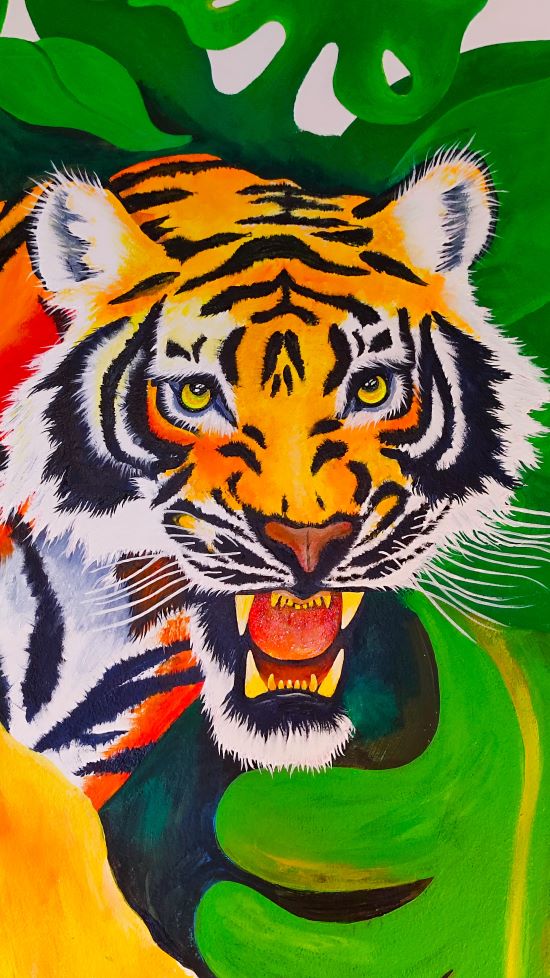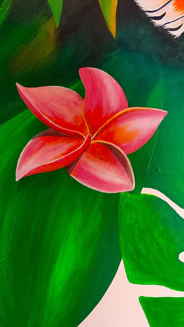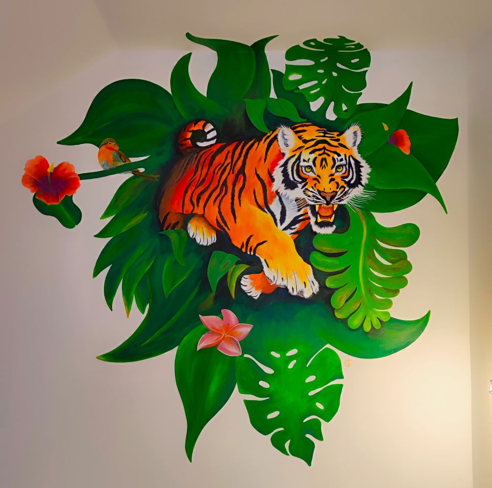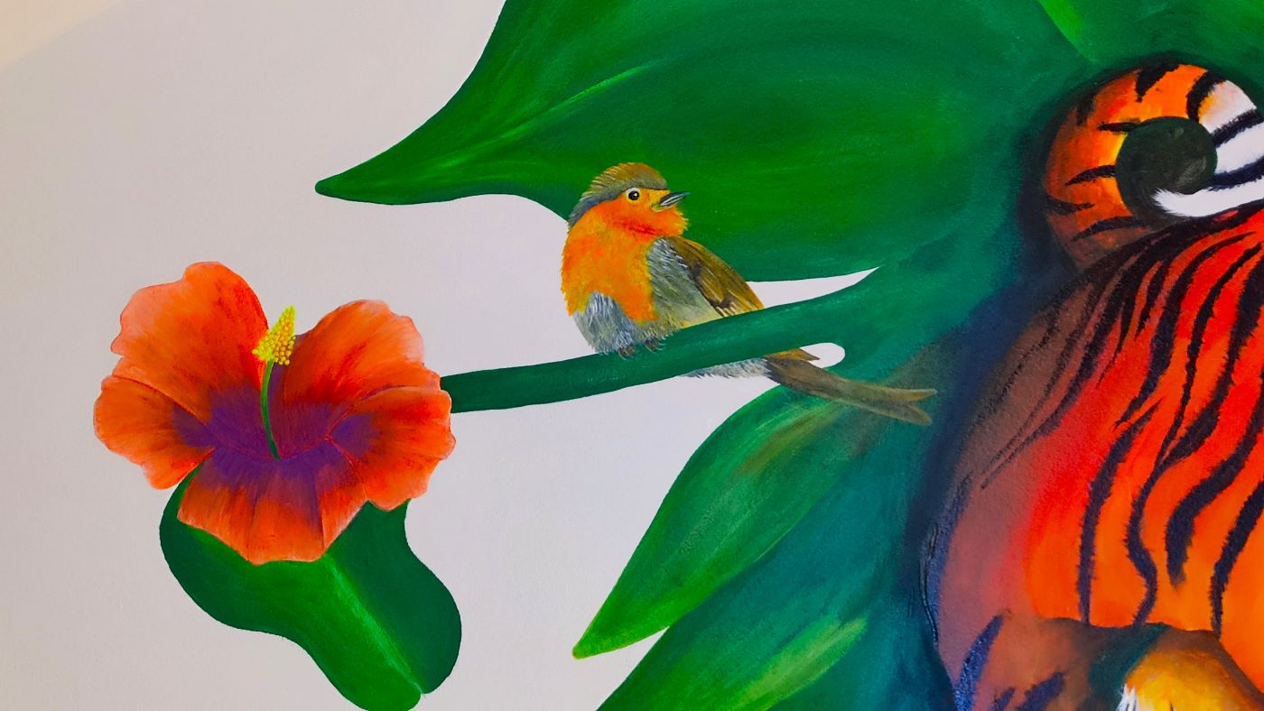 - „Der Tiger und das Rotkehlchen“ Wandmalerei in Ungarn, 1,50m X 1,50m Acryl, 2025